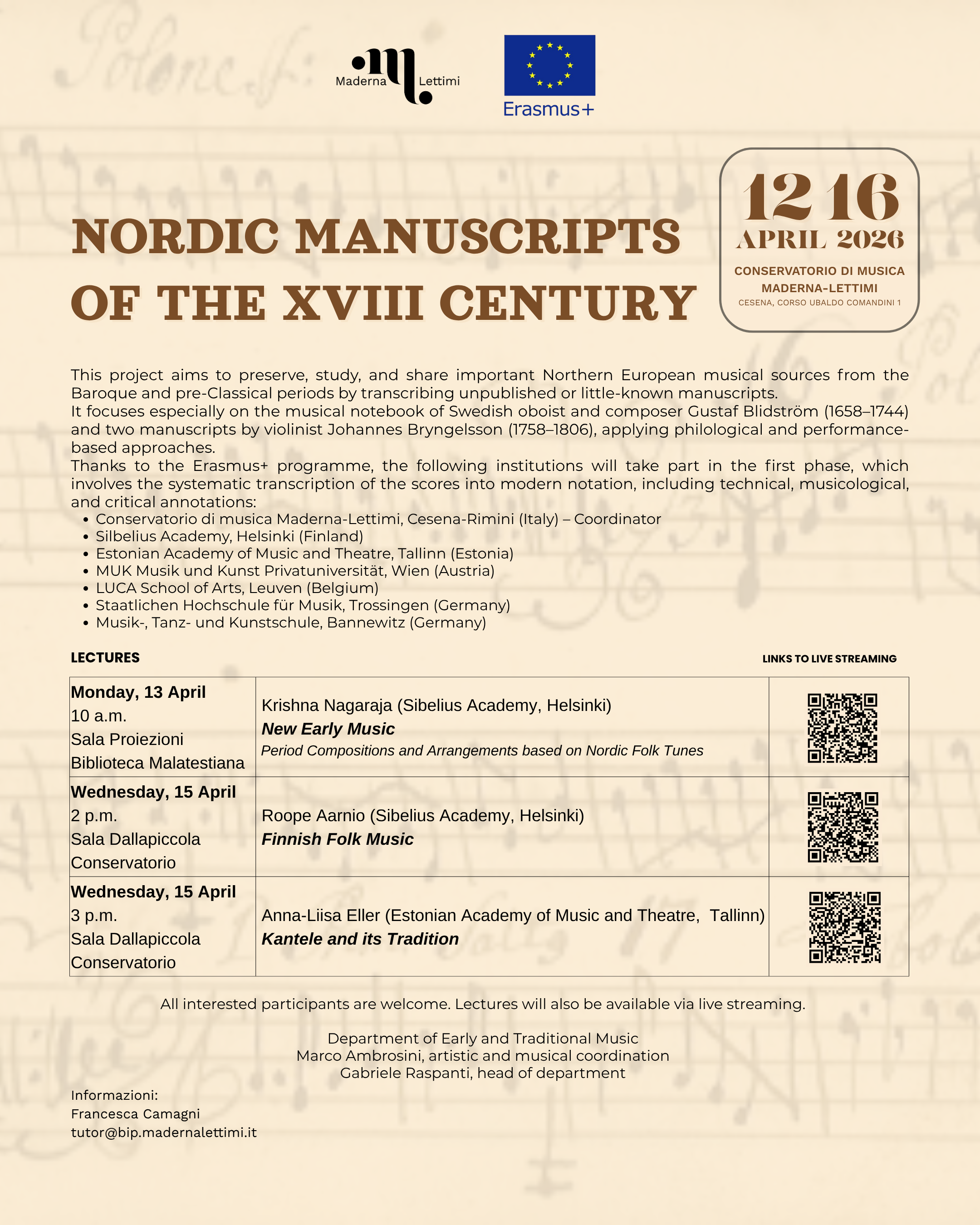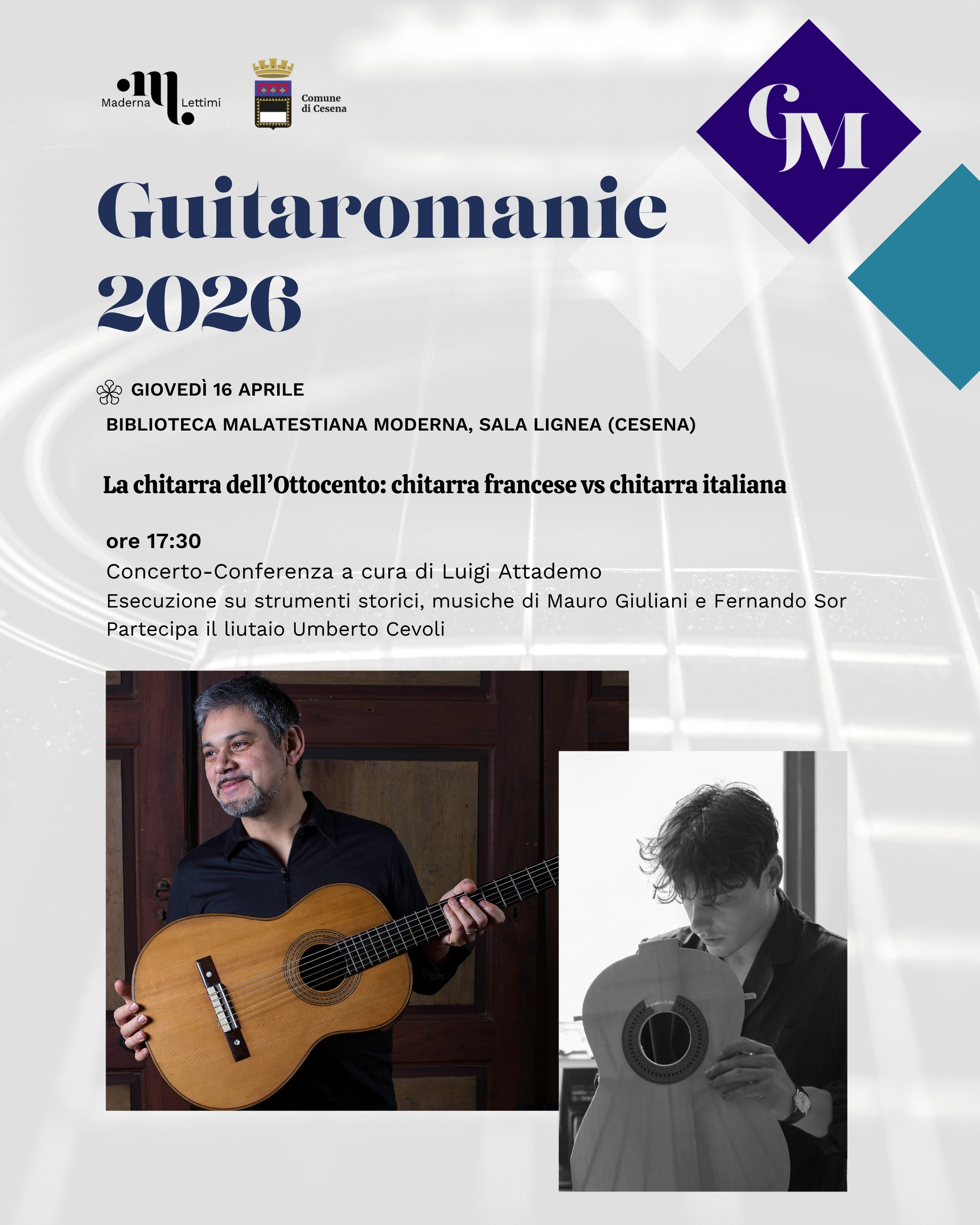 Archivio eventi Tutti Concerti Seminari e masterclass Convegni e presentazioni Rassegne Calendario Tutte cesena rimini Filtri tipo Tutti Concerti Seminari e masterclass Convegni e presentazioni Rassegne Calendario Filtri sede Tutte cesena rimini 2026 17 apr Masterclass e concerto con Pavel Steidl H • alle ore 09:30 Conservatorio, Sala Dallapiccola • Cesena Ingresso su prenotazione 16 apr Seminari di Chitarra - Guitaromanie 2026 H • alle ore 09:30 Conservatorio, Sala Dallapiccola • Cesena Ingresso libero 16 apr Concerto Sinfonico H • alle ore 20:30 Teatro Bonci • Cesena Ingresso su prenotazione 16 apr La chitarra dell’Ottocento: chitarra francese vs chitarra italiana H • alle ore 17:30 Biblioteca Malatestiana Moderna, Sala Lignea • Cesena Ingresso libero 13 apr Masterclass di Tromba con Josh Cohen H • alle ore 09:00 Istituto Corelli, Auditorium • Cesena Ingresso libero 13 apr New Early Music H • alle ore 10:00 Biblioteca Malatestiana Moderna, Sala Proiezioni (Cesena) • Cesena ingresso libero fino ad esaurimento posti 12 apr NORDIC MANUSCRIPTS OF THE XVIII CENTURY Biblioteca Malatestiana Moderna, Sala Proiezioni (Cesena) • Cesena ingresso libero fino ad esaurimento posti 11 apr Seminario Internazionale di Musicoterapia H • alle ore 09:00 Aula 6 • Cesena Ingresso libero 09 apr Masterclass di Oboe con Hernan Garreffa H • alle ore 10:00 Conservatorio, Auditorium • Rimini Ingresso su iscrizione 08 apr Risonanze e oltre con Michele Bianchini H • alle ore 14:00 Conservatorio, Sala Dallapiccola • Cesena Ingresso su prenotazione 08 apr La Musica dal Basso H • alle ore 10:00 Aula 6 • Cesena Ingresso libero 01 apr FOCUS - Rimini H • alle ore 21:00 Teatro degli Atti • Rimini Ingresso libero Pagina attuale 1 Pagina 2 Pagina 3 Pagina 4 Pagina 5 Pagina 6 Pagina 7 Pagina 8 Pagina 9 … Pagina successiva Ultima pagina Ultimo