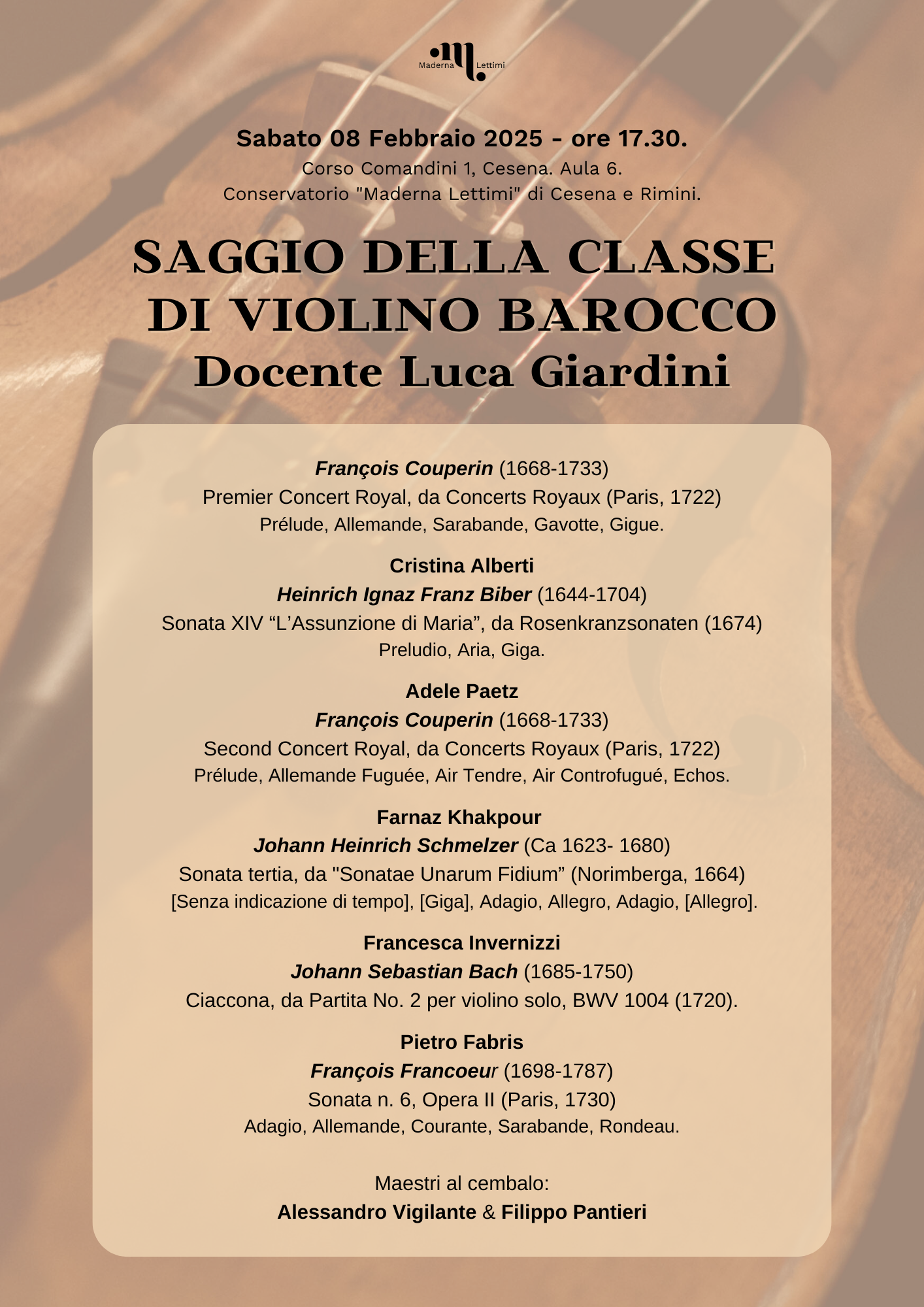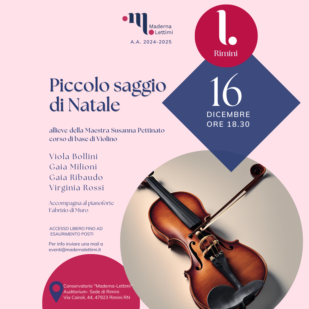 Archivio eventi Tutti Concerti Seminari e masterclass Convegni e presentazioni Rassegne Calendario Tutte cesena rimini Filtri tipo Tutti Concerti Seminari e masterclass Convegni e presentazioni Rassegne Calendario Filtri sede Tutte cesena rimini 2025 08 feb CONCERTO FINALE CONCORSO MELUCCI H • alle ore 18:30 Conservatorio, Sala Dallapiccola • Cesena ACCESSO LIBERO FINO AD ESAURIMENTO POSTI 08 feb SAGGIO DELLA CLASSE DI VIOLINO BAROCCO H • alle ore 17:30 Sala "A. Casella" - Palazzo Guidi • Cesena 06 feb M° Roberto Plano, masterclass di pianoforte e concerto H • alle ore 09:00 Conservatorio, Sala Dallapiccola • Cesena Iscrizione a numero chiuso 27 gen MUSIC FULL COACHING H • alle ore 10:00 Conservatorio, Sala Dallapiccola • Cesena Iscrizione a numero chiuso 25 gen Giornate Italiane del Cornetto 2025 Conservatorio, Sala Dallapiccola • Cesena Iscrizione a numero chiuso ai corsi - Conferenze ad accesso libero 13 gen Workshop con Davide Bianchi H • alle ore 10:00 Conservatorio, Auditorium • Rimini Iscrizione a numero chiuso 2024 18 dic Auguri di Natale... in Musica H • alle ore 17:45 Conservatorio, Biblioteca • Rimini Accesso libero fino a esaurimento posti 16 dic Piccolo Saggio di Natale H • alle ore 18:45 Conservatorio, Auditorium • Rimini Accesso libero fino a esaurimento posti 14 dic Concerto Borsa di studio "Enzo Marani" H • alle ore 17:00 Conservatorio, Auditorium • Rimini Accesso libero fino a esaurimento posti 10 dic Masterclass di violino con Gabriele Pieranunzi H • alle ore 10:00 Conservatorio, Auditorium • Rimini Iscrizione a numero chiuso 27 nov Meeting chitarristico H • alle ore 15:30 Conservatorio, Auditorium • Rimini 18 ott Rimini celebra i 70 anni di Romagna mia H • alle ore 10:00 Teatro Galli • Rimini Prima pagina Primo Pagina precedente … Pagina 9 Pagina 10 Pagina 11 Pagina 12 Pagina attuale 13 Pagina 14 Pagina 15 Pagina 16 Pagina 17 … Pagina successiva Ultima pagina Ultimo