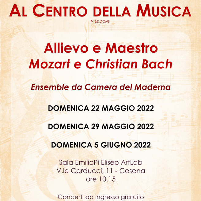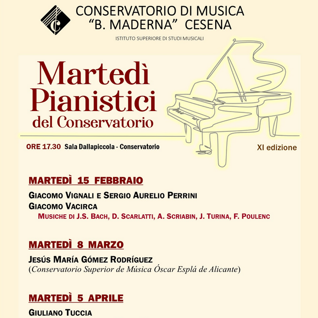 Archivio eventi Tutti Concerti Seminari e masterclass Convegni e presentazioni Rassegne Calendario Tutte cesena rimini Filtri tipo Tutti Concerti Seminari e masterclass Convegni e presentazioni Rassegne Calendario Filtri sede Tutte cesena rimini 2022 13 giu KAMMERMUSIK H • alle ore 21:00 Conservatorio, Corte interna • Cesena Ingresso libero fino ad esaurimento posti 11 giu Corelli Jazz quintet special guest Simone Zanchini H • alle ore 21:00 Conservatorio, Corte interna • Cesena 11 giu Corelli jazz quintet H • alle ore 21:00 Conservatorio, Corte interna • Cesena Ingresso libero fino ad esaurimento posti 10 giu Maderna Jazz night Jam Session H • alle ore 21:00 La Cantera • Cesena 08 giu Nuit d'ètè avec Donizetti H • alle ore 20:00 Conservatorio, Corte interna • Cesena Ingresso libero fino ad esaurimento posti 07 giu Conferenza su Nina Simone H • alle ore 15:00 Conservatorio (sede Maderna) • Cesena 22 mag Allievo e Maestro: Mozart e Christian Bach H • alle ore 10:15 Ingresso libero fino ad esaurimento posti 03 giu Masterclass e Concerto di Arpa Conservatorio, Sala Dallapiccola • Cesena Ingresso libero fino ad esaurimento posti 27 mag Conversazione con Carlo Crivelli H • alle ore 16:00 Sala EmilioPi Eliseo ArtLab • Cesena Ingresso libero fino ad esaurimento posti 15 feb Martedì pianistici del Conservatorio H • alle ore 17:30 Conservatorio, Sala Dallapiccola • Cesena 24 mag Masterclass di Strumenti a percussione Conservatorio (sede Maderna) • Cesena 21 mag Convegno Musica Dentro H • alle ore 09:00 Prima pagina Primo Pagina precedente … Pagina 29 Pagina 30 Pagina 31 Pagina 32 Pagina attuale 33 Pagina 34 Pagina 35 Pagina 36 Pagina 37 … Pagina successiva Ultima pagina Ultimo
