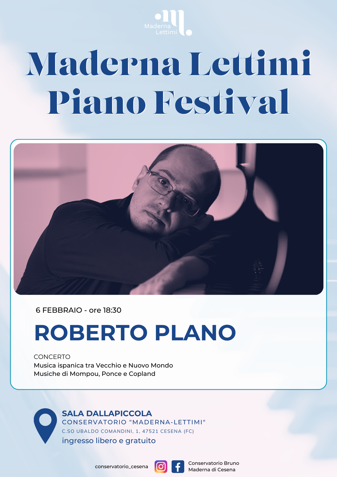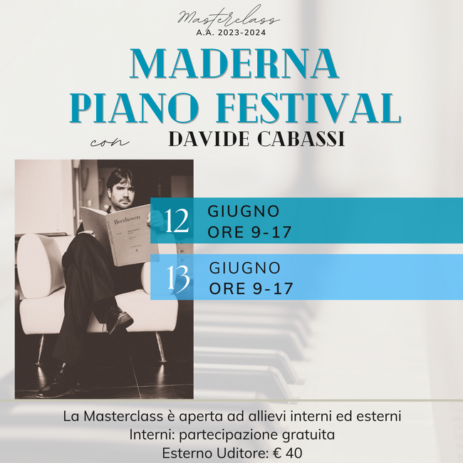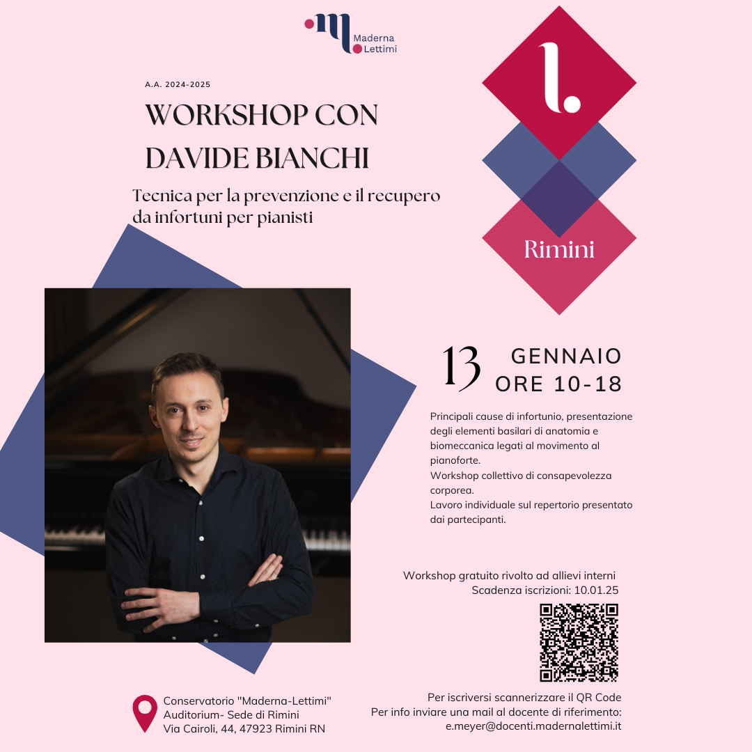Archivio eventi Tutti Concerti Seminari e masterclass Convegni e presentazioni Rassegne Calendario Tutte cesena rimini Filtri tipo Tutti Concerti Seminari e masterclass Convegni e presentazioni Rassegne Calendario Filtri sede Tutte cesena rimini 2025 24 feb M° Tomasz Tomaszewki, masterclass di violino Conservatorio, Auditorium • Rimini Iscrizione a numero chiuso 22 feb Le musiciste nella storia e nella società H • alle ore 14:30 Conservatorio, Sala Dallapiccola • Cesena 10 feb MASTERCLASS con GIORGIO SANCRISTOFORO Conservatorio, Sala Dallapiccola • Cesena 06 feb M° Roberto Plano, masterclass di pianoforte e concerto H • alle ore 09:00 Conservatorio, Sala Dallapiccola • Cesena Iscrizione a numero chiuso 27 gen MUSIC FULL COACHING H • alle ore 10:00 Conservatorio, Sala Dallapiccola • Cesena Iscrizione a numero chiuso 13 gen Workshop con Davide Bianchi H • alle ore 10:00 Conservatorio, Auditorium • Rimini Iscrizione a numero chiuso 2024 10 dic Masterclass di violino con Gabriele Pieranunzi H • alle ore 10:00 Conservatorio, Auditorium • Rimini Iscrizione a numero chiuso 27 nov Meeting chitarristico H • alle ore 15:30 Conservatorio, Auditorium • Rimini 10 ott LE DUE MAGDE, IL CANTO TRAGICO PER LA LIBERTÀ H • alle ore 18:00 Conservatorio, Sala Dallapiccola • Cesena Ingresso libero fino ad esaurimento posti 12 giu MASTERCLASS con DAVIDE CABASSI H • alle ore 09:00 Conservatorio, Sala Dallapiccola • Cesena Iscrizione a numero chiuso 21 mag MASTERCLASS con ROBERTO PROSSEDA H • alle ore 09:00 Conservatorio (sede Maderna) • Cesena Iscrizione a numero chiuso 14 mag MASTERCLASS DI CANTO BAROCCO con CLARON MCFADDEN H • alle ore 15:00 Conservatorio (sede Maderna) • Cesena Iscrizione a numero chiuso Prima pagina Primo Pagina precedente … Pagina 2 Pagina 3 Pagina 4 Pagina 5 Pagina attuale 6 Pagina 7 Pagina 8 Pagina 9 Pagina 10 … Pagina successiva Ultima pagina Ultimo