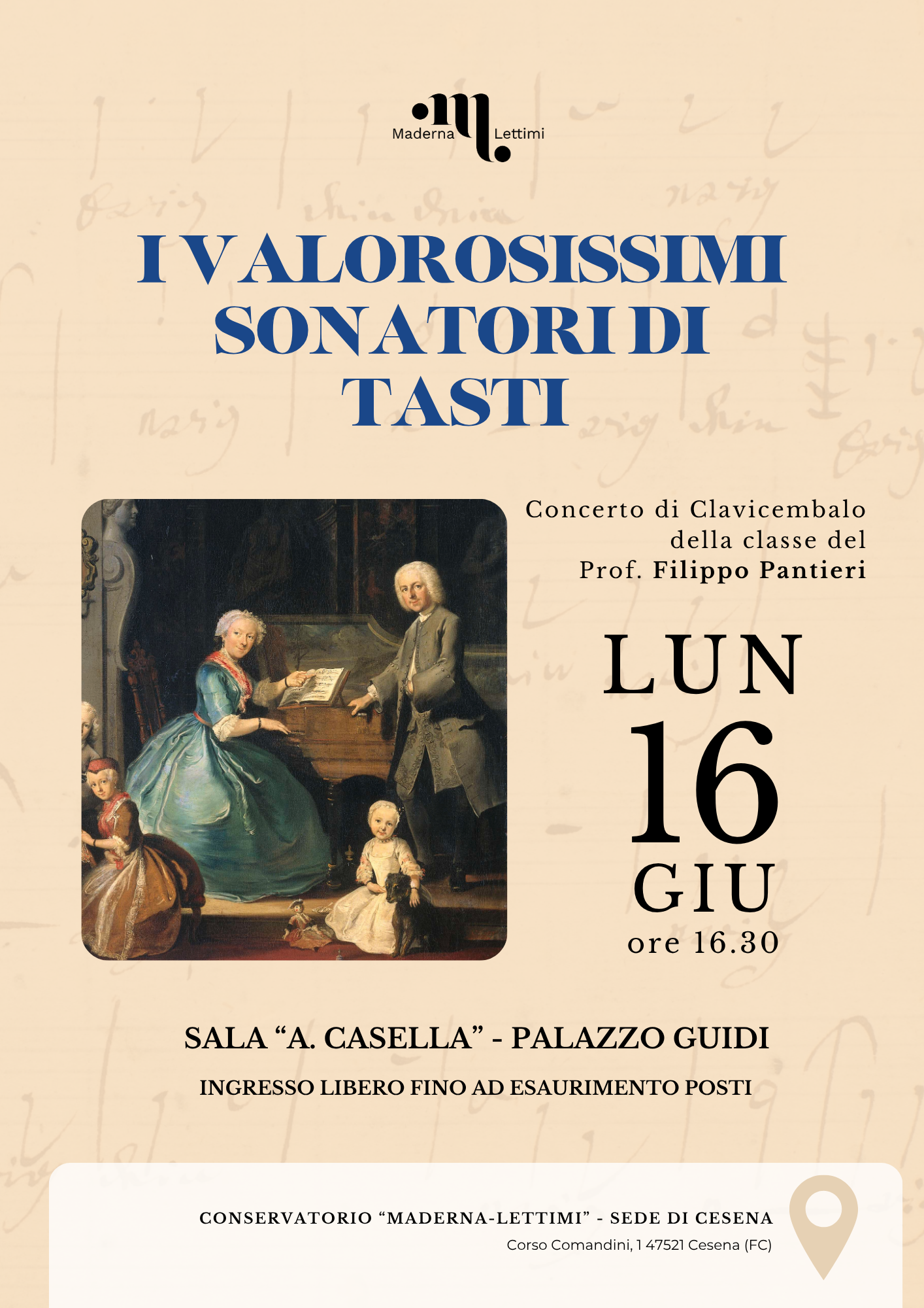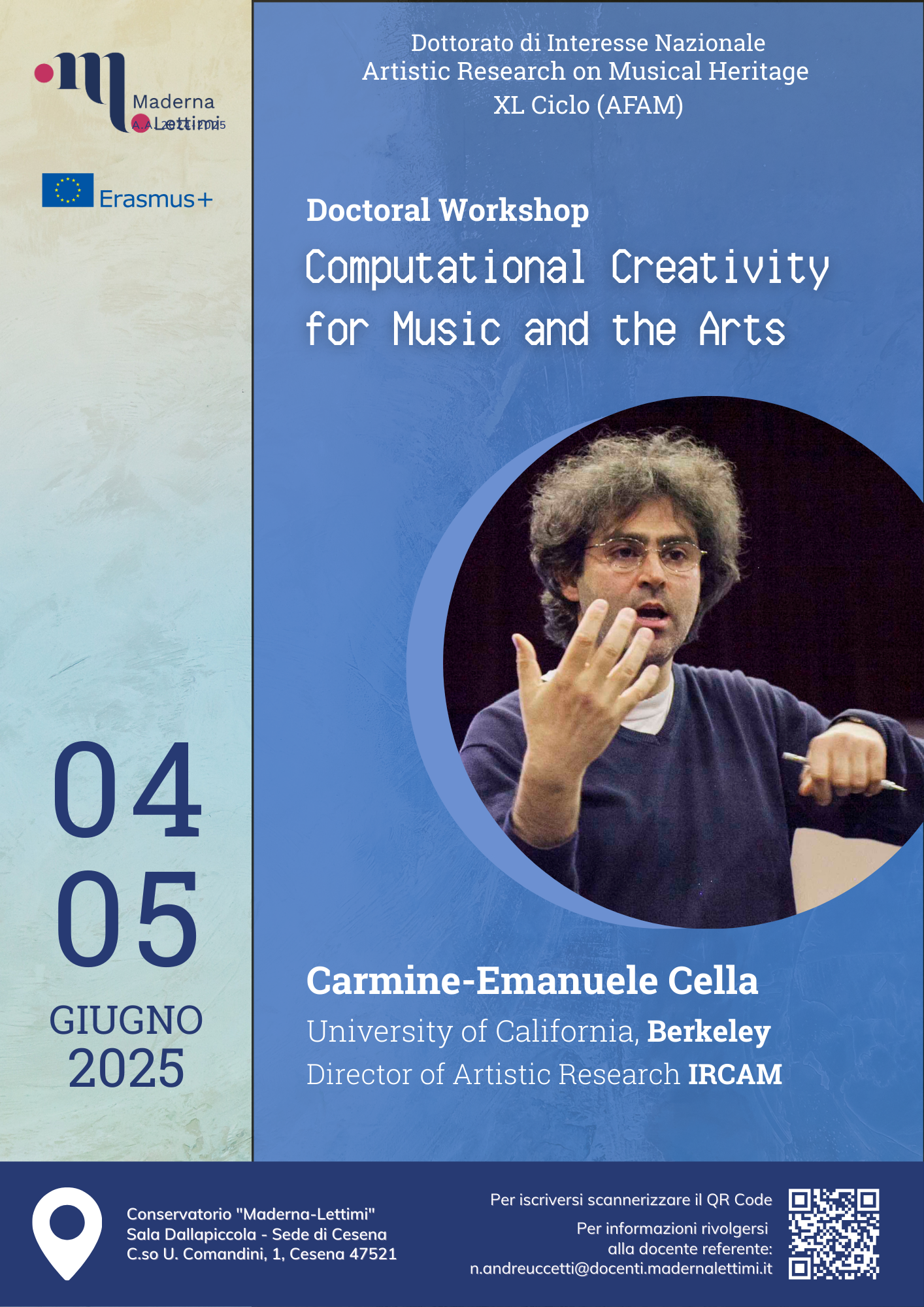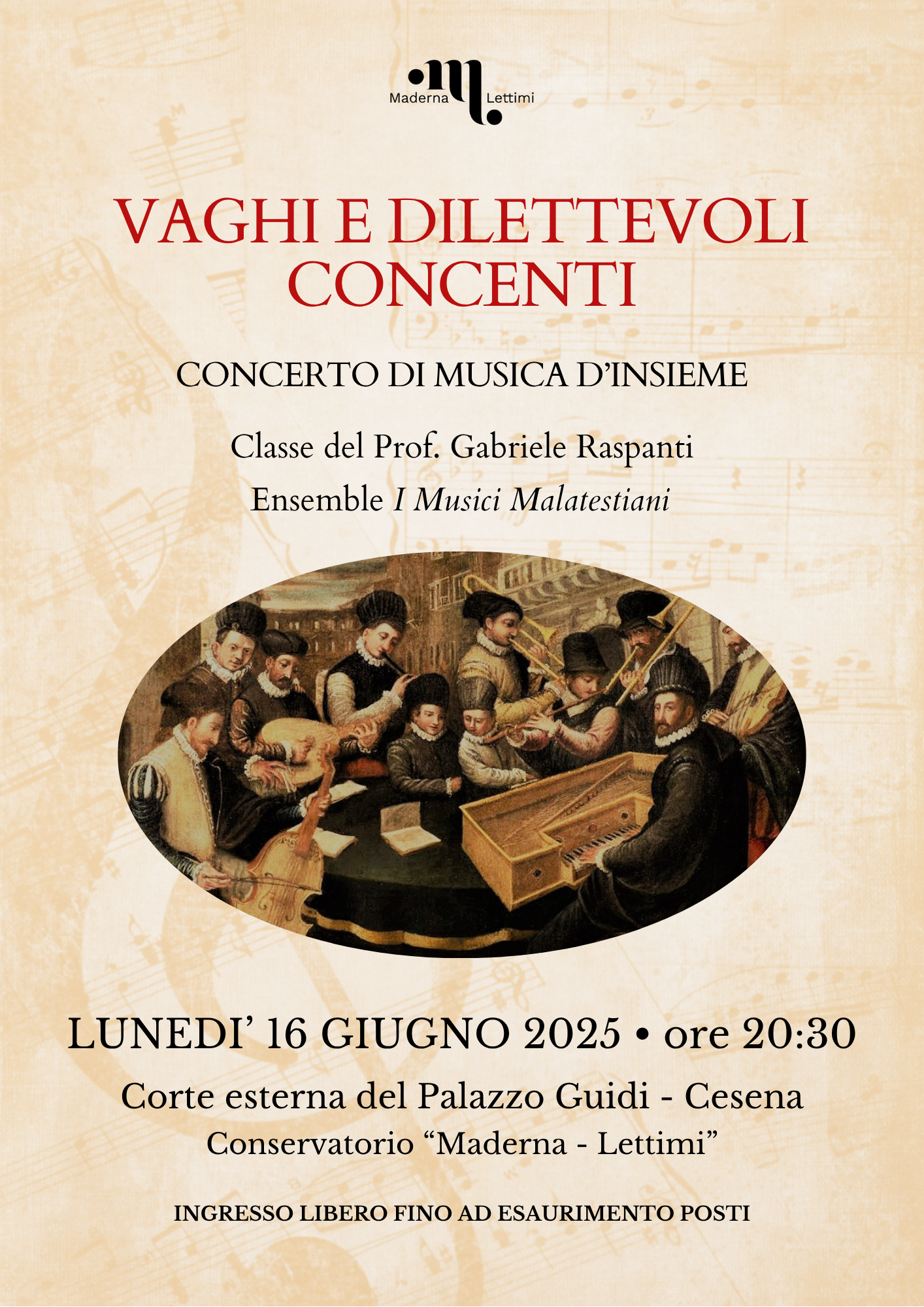Archivio eventi Tutti Concerti Seminari e masterclass Convegni e presentazioni Rassegne Calendario Tutte cesena rimini Filtri tipo Tutti Concerti Seminari e masterclass Convegni e presentazioni Rassegne Calendario Filtri sede Tutte cesena rimini 2025 16 giu Vaghi e dilettevoli Concenti H • alle ore 20:30 Conservatorio, Corte interna • Cesena Ingresso libero fino ad esaurimento posti 16 giu I Valorosissimi Sonatori di Tasti H • alle ore 16:30 Sala "A. Casella" - Palazzo Guidi • Cesena Ingresso libero fino ad esaurimento posti 13 giu Il I Libro delle Toccate di G. Frescobaldi H • alle ore 16:30 Conservatorio, Biblioteca • Rimini Ingresso libero fino ad esaurimento posti 09 giu BIG BAND MADERNA-LETTIMI H • alle ore 21:00 Conservatorio, Corte interna • Cesena ingresso libero fino ad esaurimento posti 06 giu MARCO FRATTINI SOLO • NELLE SUE PAROLE H • alle ore 21:00 Conservatorio, Corte interna • Cesena ingresso libero fino ad esaurimento posti 06 giu DONIZETTI E LE DONNE EMANCIPATE H • alle ore 17:00 Conservatorio, Auditorium • Rimini Accesso libero fino a esaurimento posti 05 giu ESIBIZIONE DEI QUATTRO FINALISTI H • alle ore 20:00 Conservatorio, Corte interna • Cesena ingresso libero fino ad esaurimento posti 04 giu Computational Creativity for Music and the Arts H • alle ore 09:00 Conservatorio, Sala Dallapiccola • Cesena Iscrizione a numero chiuso previa iscrizione 04 giu ENRICO BRACCO & NICOLA DI TOMMASO DUO H • alle ore 21:00 Conservatorio, Corte interna • Cesena ingresso libero fino ad esaurimento posti 03 giu SONGS FOR THOUGHT H • alle ore 18:00 Conservatorio, Corte interna • Cesena ingresso libero fino ad esaurimento posti 03 giu M° Igor Roma, masterclass di pianoforte Conservatorio, Auditorium • Rimini iscrizione obbligatoria 30 mag DONIZETTI E LE DONNE EMANCIPATE H • alle ore 17:00 Conservatorio, Auditorium • Rimini Accesso libero fino a esaurimento posti Prima pagina Primo Pagina precedente … Pagina 4 Pagina 5 Pagina 6 Pagina 7 Pagina attuale 8 Pagina 9 Pagina 10 Pagina 11 Pagina 12 … Pagina successiva Ultima pagina Ultimo