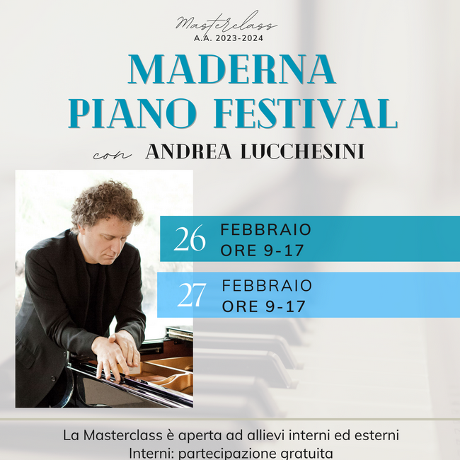 Archivio eventi Tutti Concerti Seminari e masterclass Convegni e presentazioni Rassegne Calendario Tutte cesena rimini Filtri tipo Tutti Concerti Seminari e masterclass Convegni e presentazioni Rassegne Calendario Filtri sede Tutte cesena rimini 2024 04 apr MASTERCLASS DI LIUTO con MASSIMO LONARDI H • alle ore 11:00 Conservatorio, Sala Dallapiccola • Cesena Iscrizione a numero chiuso 14 mar MASTERCLASS con ALBERTO ALLEGREZZA H • alle ore 11:00 Conservatorio (sede Maderna) • Cesena Iscrizione a numero chiuso 11 mar MASTERCLASS con ALESSANDRO CORBELLI H • alle ore 10:00 Conservatorio (sede Maderna) • Cesena Iscrizione a numero chiuso 12 mar MASTERCLASS con ILIA KIM H • alle ore 09:00 Conservatorio (sede Maderna) • Cesena Iscrizione a numero chiuso 26 feb MASTERCLASS con ANDREA LUCCHESINI H • alle ore 09:00 Conservatorio (sede Maderna) • Cesena Iscrizione a numero chiuso 01 feb LO STUDIO DI REGISTRAZIONE COME STRUMENTO MUSICALE H • alle ore 10:00 Conservatorio, Sala Dallapiccola • Cesena 29 gen MASTERCLASS con MONICA BACELLI H • alle ore 15:00 Conservatorio (sede Maderna) • Cesena 2023 01 dic IL TEATRO IN MUSICA H • alle ore 15:00 Conservatorio, Sala Dallapiccola • Cesena Il seminario è libero e gratuito 27 ott Masterclass di improvvisazione jazzistica, M° Beltrani H • alle ore 09:00 Conservatorio, Auditorium • Rimini 27 ott Masterclass di improvvisazione jazzistica M° Beltrani H • alle ore 09:00 Conservatorio, Auditorium • Rimini Iscrizione a numero chiuso 18 ott MASTERCLASS DI TROMBA con MAX SOMMERHALDER H • alle ore 09:30 Conservatorio (sede Maderna) • Cesena 19 ott Masterclass di violino, M° Tomaszewski Conservatorio (sede Lettimi) • Rimini Prima pagina Primo Pagina precedente … Pagina 4 Pagina 5 Pagina 6 Pagina 7 Pagina attuale 8 Pagina 9 Pagina 10 Pagina 11 Pagina 12 … Pagina successiva Ultima pagina Ultimo
