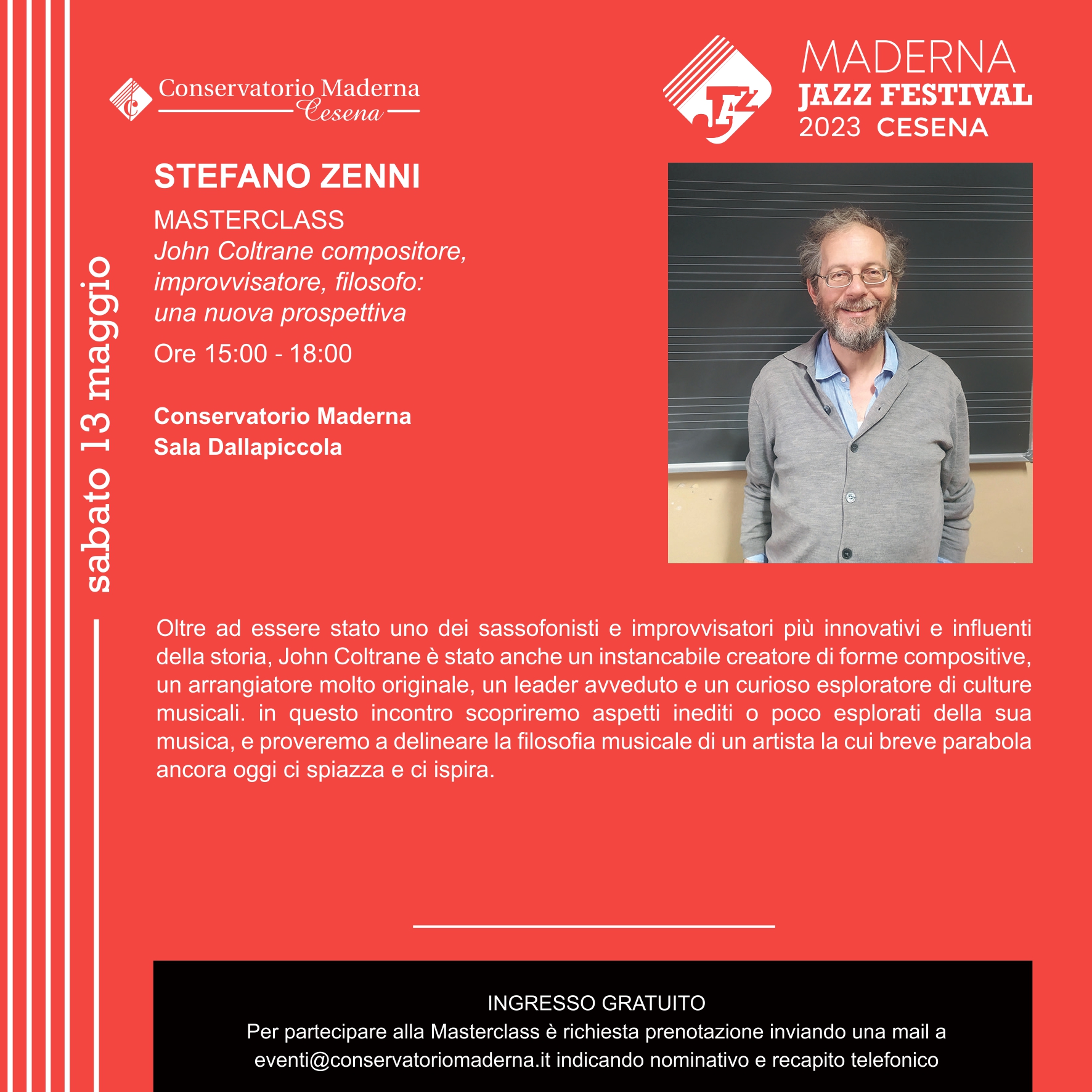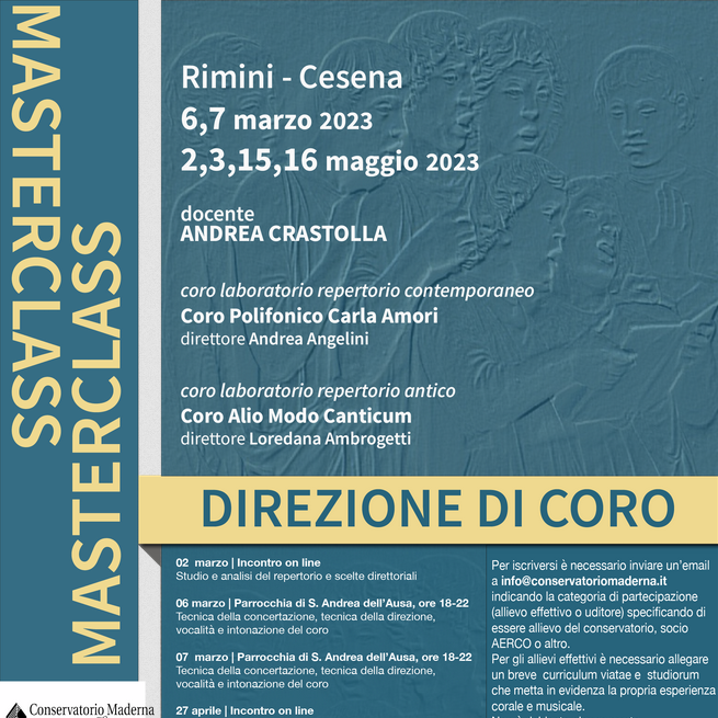 Archivio eventi Tutti Concerti Seminari e masterclass Convegni e presentazioni Rassegne Calendario Tutte cesena rimini Filtri tipo Tutti Concerti Seminari e masterclass Convegni e presentazioni Rassegne Calendario Filtri sede Tutte cesena rimini 2023 12 ott Suonare il passato H • alle ore 09:30 Rimini 05 ott Coaching e PNL per il musicista “Dai Voce e Musica alla tua Vita”, M° Barbuto H • alle ore 14:00 Rimini Iscrizione a numero chiuso 05 ott Video della Masterclass di Coaching e PNL per il Musicista tenuta dal M° Francesco Barbuto Conservatorio, Auditorium • Rimini 21 set MASTERCLASS DI FLAUTO H • alle ore 10:00 Conservatorio (sede Maderna) • Cesena Iscrizione a numero chiuso 15 giu IMMAGINARIO GUIDATO IN MUSICA H • alle ore 14:30 Conservatorio (sede Maderna) • Cesena 14 giu MASTERCLASS di FLAUTO H • alle ore 09:00 Conservatorio (sede Maderna) • Cesena 26 mag Masterclass di musica da camera H • alle ore 10:00 Conservatorio (sede Maderna) • Cesena 02 mar MASTERCLASS DIREZIONE DI CORO 13 mag STEFANO ZENNI H • alle ore 15:00 Conservatorio, Sala Dallapiccola • Cesena Iscrizione a numero chiuso 11 mag Masterclass del pianista Evgheny Brakhman H • alle ore 09:00 Iscrizione a numero chiuso 09 mag MASTERCLASS con GILE BAE H • alle ore 09:00 Conservatorio, Sala Dallapiccola • Cesena 27 apr MASTERCLASS con ALESSANDRO TAVERNA H • alle ore 09:00 Conservatorio, Sala Dallapiccola • Cesena Prima pagina Primo Pagina precedente … Pagina 5 Pagina 6 Pagina 7 Pagina 8 Pagina attuale 9 Pagina 10 Pagina 11 Pagina 12 Pagina 13 Pagina successiva Ultima pagina Ultimo