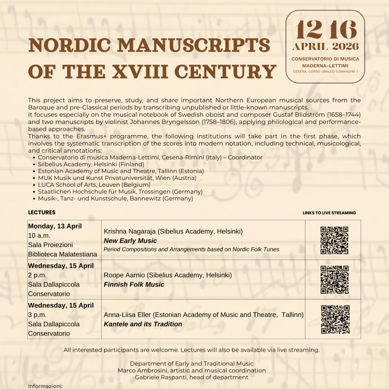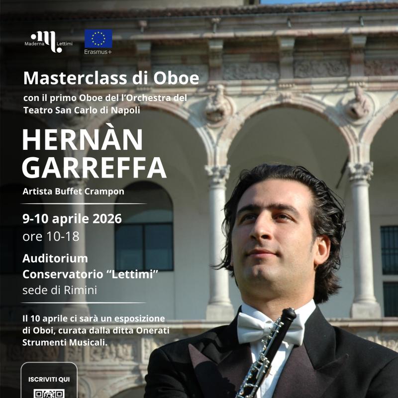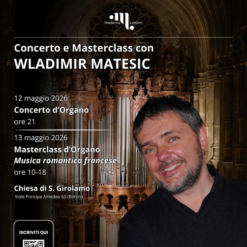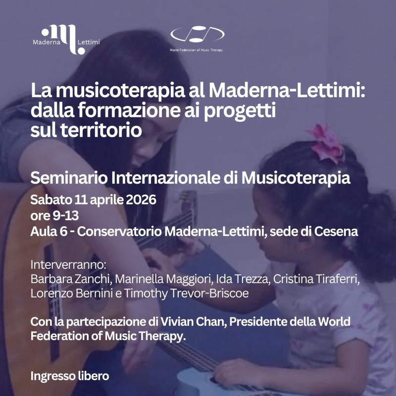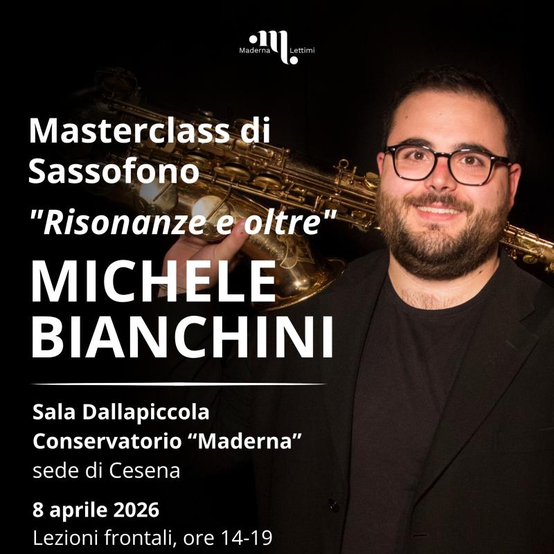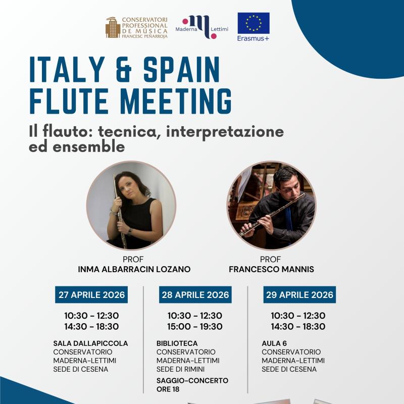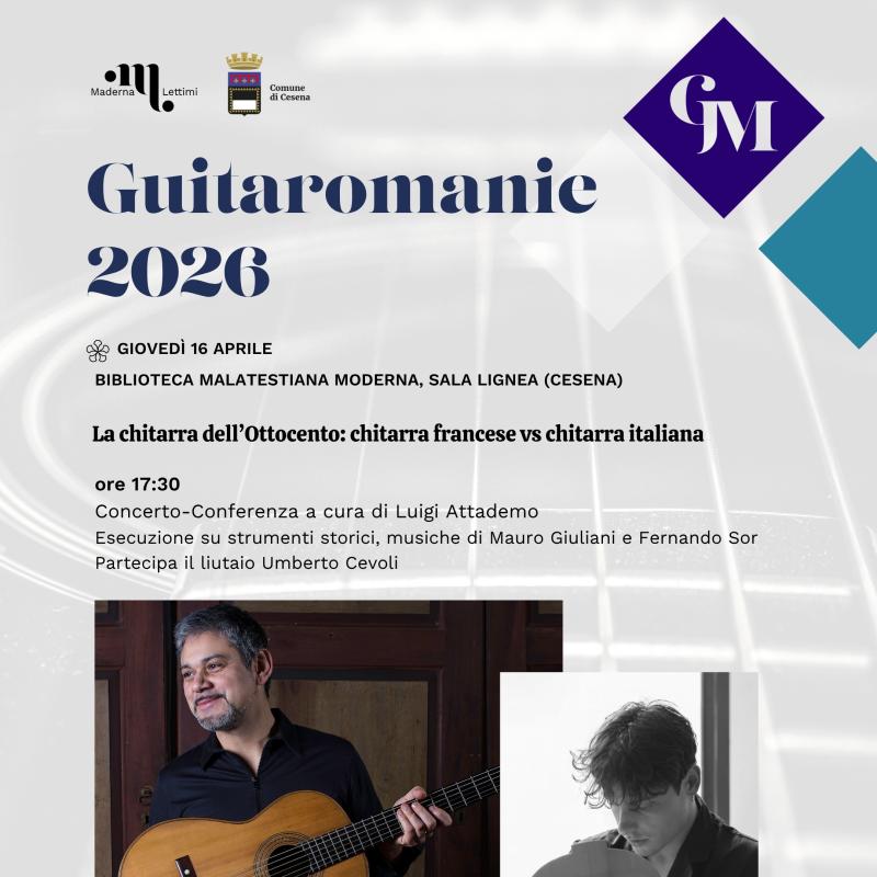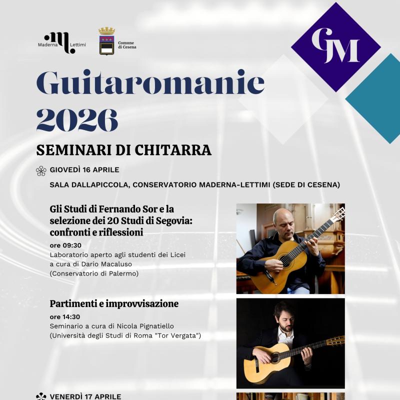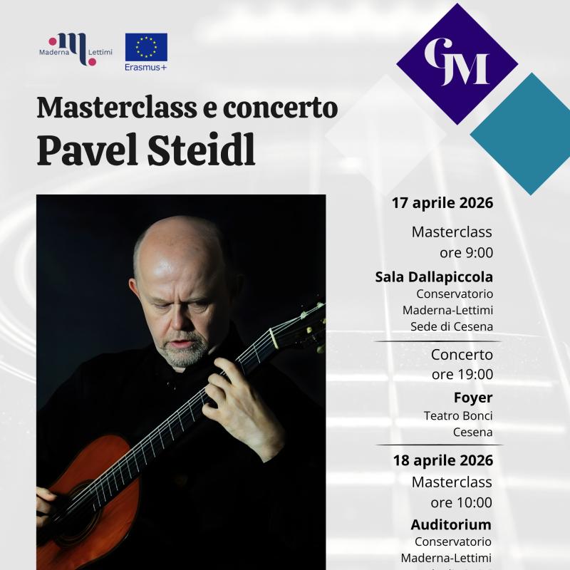 Eventi Tutti Concerti Seminari e masterclass Convegni e presentazioni Rassegne Archivio Tutte cesena rimini Filtri tipo Tutti Concerti Seminari e masterclass Convegni e presentazioni Rassegne Archivio Filtri sede Tutte cesena rimini Calendario eventi Le date in programma Prossimi Eventi 16 apr aprile Seminari di Chitarra - Guitaromanie 2026 H • alle ore 09:30 Conservatorio, Sala Dallapiccola • Cesena Ingresso libero 17 apr aprile Masterclass e concerto con Pavel Steidl H • alle ore 09:30 Conservatorio, Sala Dallapiccola • Cesena Ingresso su prenotazione 21 apr aprile ALEX CARRERI H • alle ore 14:30 Aula 20 • Cesena Ingresso libero 21 apr aprile LUDUS TONALIS: Il gioco serio della tonalità H • alle ore 17:00 Conservatorio, Auditorium • Rimini Accesso libero fino a esaurimento posti 22 apr aprile Papageno e Il Flauto Magico H • alle ore 15:00 Conservatorio, Auditorium • Rimini Ingresso libero fino a esaurimento posti 24 apr aprile Masterclass su Girolamo Frescobaldi al Cembalo e all’Organo H • alle ore 10:00 Aula 6 • Cesena Ingresso libero a numero chiuso 27 apr aprile Italy & Spain Flute Meeting H • alle ore 10:30 Conservatorio, Sala Dallapiccola • Cesena Ingresso libero 27 apr aprile Il volto pianistico di Ermanno Wolf-Ferrari H • alle ore 17:00 Conservatorio, Auditorium • Rimini Accesso libero fino a esaurimento posti 12 mag maggio Concerto e Masterclass con Wladimir Matesic H • alle ore 21:00 Chiesa di S. Girolamo • Rimini Ingresso su prenotazione 13 mag maggio Tecniche di improvvisazione + LOVE SONGS H • alle ore 14:00 Conservatorio, Sala Dallapiccola • Cesena Ingresso libero 18 mag maggio THE EVOLUTION OF SOLO JAZZ PIANO (analisi di 24 stili pianistici) H • alle ore 10:30 Conservatorio, Sala Dallapiccola • Cesena Ingresso libero 25 mag maggio FUORI CLASSE! Ensemble della classe di sassofono jazz H • alle ore 19:00 Conservatorio, Sala Dallapiccola • Cesena Ingresso libero Pagina attuale 1 Pagina 2 Pagina successiva Ultima pagina Ultimo Archivio eventi 17 apr aprile Masterclass e concerto con Pavel Steidl H • alle ore 09:30 Conservatorio, Sala Dallapiccola • Cesena Ingresso su prenotazione 16 apr aprile Seminari di Chitarra - Guitaromanie 2026 H • alle ore 09:30 Conservatorio, Sala Dallapiccola • Cesena Ingresso libero 16 apr aprile Concerto Sinfonico H • alle ore 20:30 Teatro Bonci • Cesena Ingresso su prenotazione 16 apr aprile La chitarra dell’Ottocento: chitarra francese vs chitarra italiana H • alle ore 17:30 Biblioteca Malatestiana Moderna, Sala Lignea • Cesena Ingresso libero 13 apr aprile Masterclass di Tromba con Josh Cohen H • alle ore 09:00 Istituto Corelli, Auditorium • Cesena Ingresso libero 13 apr aprile New Early Music H • alle ore 10:00 Biblioteca Malatestiana Moderna, Sala Proiezioni (Cesena) • Cesena ingresso libero fino ad esaurimento posti 12 apr aprile NORDIC MANUSCRIPTS OF THE XVIII CENTURY Biblioteca Malatestiana Moderna, Sala Proiezioni (Cesena) • Cesena ingresso libero fino ad esaurimento posti 11 apr aprile Seminario Internazionale di Musicoterapia H • alle ore 09:00 Aula 6 • Cesena Ingresso libero 09 apr aprile Masterclass di Oboe con Hernan Garreffa H • alle ore 10:00 Conservatorio, Auditorium • Rimini Ingresso su iscrizione 08 apr aprile Risonanze e oltre con Michele Bianchini H • alle ore 14:00 Conservatorio, Sala Dallapiccola • Cesena Ingresso su prenotazione 08 apr aprile La Musica dal Basso H • alle ore 10:00 Aula 6 • Cesena Ingresso libero 01 apr aprile FOCUS - Rimini H • alle ore 21:00 Teatro degli Atti • Rimini Ingresso libero Vedi tutto l'archivio eventi >