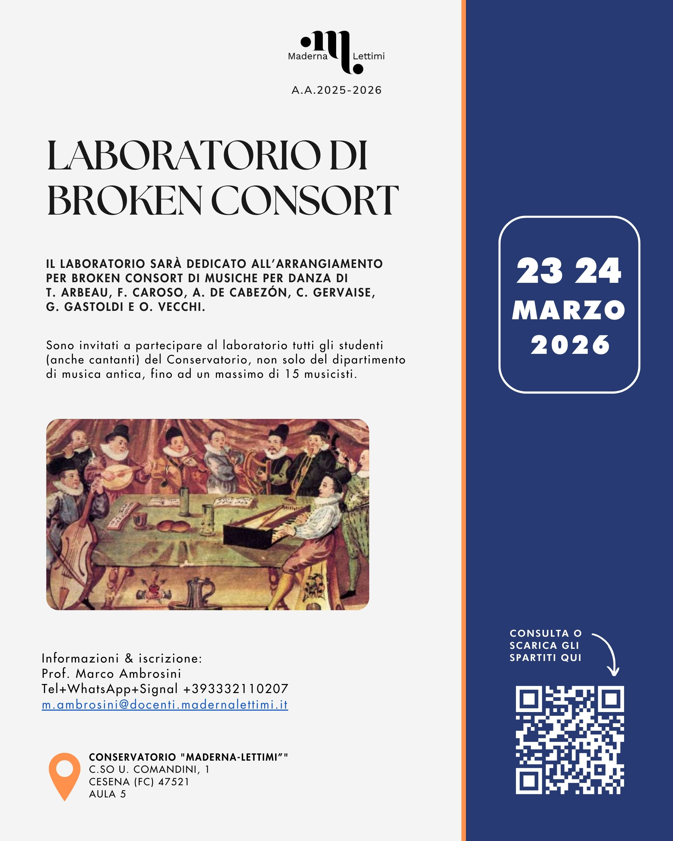 Il Laboratorio sarà dedicato all'arrangiamento per Broken Consort di Musiche Per Danza Di T. Arbeau, F. Caroso, A. De CabezóN, C. Gervaise, G. Gastoldi E O. Vecchi.