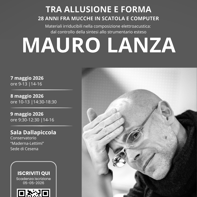 Eventi Tutti Concerti Seminari e masterclass Convegni e presentazioni Rassegne Archivio Tutte cesena rimini Filtri tipo Tutti Concerti Seminari e masterclass Convegni e presentazioni Rassegne Archivio Filtri sede Tutte cesena rimini Calendario eventi Le date in programma Prossimi Eventi 16 apr aprile Seminari di Chitarra - Guitaromanie 2026 H • alle ore 09:30 Conservatorio, Sala Dallapiccola • Cesena Ingresso libero 17 apr aprile Masterclass e concerto con Pavel Steidl H • alle ore 09:30 Conservatorio, Sala Dallapiccola • Cesena Ingresso su prenotazione 21 apr aprile ALEX CARRERI H • alle ore 14:30 Aula 20 • Cesena Ingresso libero 21 apr aprile LUDUS TONALIS: Il gioco serio della tonalità H • alle ore 17:00 Conservatorio, Auditorium • Rimini Accesso libero fino a esaurimento posti 22 apr aprile Papageno e Il Flauto Magico H • alle ore 15:00 Conservatorio, Auditorium • Rimini Ingresso libero fino a esaurimento posti 24 apr aprile Masterclass su Girolamo Frescobaldi al Cembalo e all’Organo H • alle ore 10:00 Aula 6 • Cesena Ingresso libero a numero chiuso 27 apr aprile Italy & Spain Flute Meeting H • alle ore 10:30 Conservatorio, Sala Dallapiccola • Cesena Ingresso libero 27 apr aprile Il volto pianistico di Ermanno Wolf-Ferrari H • alle ore 17:00 Conservatorio, Auditorium • Rimini Accesso libero fino a esaurimento posti 07 mag maggio Masterclass di MAURO LANZA H • alle ore 09:00 Conservatorio, Sala Dallapiccola • Cesena 12 mag maggio Concerto e Masterclass con Wladimir Matesic H • alle ore 21:00 Chiesa di S. Girolamo • Rimini Ingresso su prenotazione 13 mag maggio Tecniche di improvvisazione + LOVE SONGS H • alle ore 14:00 Conservatorio, Sala Dallapiccola • Cesena Ingresso libero 18 mag maggio THE EVOLUTION OF SOLO JAZZ PIANO (analisi di 24 stili pianistici) H • alle ore 10:30 Conservatorio, Sala Dallapiccola • Cesena Ingresso libero Pagina attuale 1 Pagina 2 Pagina successiva Ultima pagina Ultimo Archivio eventi 17 apr aprile Masterclass e concerto con Pavel Steidl H • alle ore 09:30 Conservatorio, Sala Dallapiccola • Cesena Ingresso su prenotazione 16 apr aprile Seminari di Chitarra - Guitaromanie 2026 H • alle ore 09:30 Conservatorio, Sala Dallapiccola • Cesena Ingresso libero 16 apr aprile Concerto Sinfonico H • alle ore 20:30 Teatro Bonci • Cesena Ingresso su prenotazione 16 apr aprile La chitarra dell’Ottocento: chitarra francese vs chitarra italiana H • alle ore 17:30 Biblioteca Malatestiana Moderna, Sala Lignea • Cesena Ingresso libero 13 apr aprile Masterclass di Tromba con Josh Cohen H • alle ore 09:00 Istituto Corelli, Auditorium • Cesena Ingresso libero 13 apr aprile New Early Music H • alle ore 10:00 Biblioteca Malatestiana Moderna, Sala Proiezioni (Cesena) • Cesena ingresso libero fino ad esaurimento posti 12 apr aprile NORDIC MANUSCRIPTS OF THE XVIII CENTURY Biblioteca Malatestiana Moderna, Sala Proiezioni (Cesena) • Cesena ingresso libero fino ad esaurimento posti 11 apr aprile Seminario Internazionale di Musicoterapia H • alle ore 09:00 Aula 6 • Cesena Ingresso libero 09 apr aprile Masterclass di Oboe con Hernan Garreffa H • alle ore 10:00 Conservatorio, Auditorium • Rimini Ingresso su iscrizione 08 apr aprile Risonanze e oltre con Michele Bianchini H • alle ore 14:00 Conservatorio, Sala Dallapiccola • Cesena Ingresso su prenotazione 08 apr aprile La Musica dal Basso H • alle ore 10:00 Aula 6 • Cesena Ingresso libero 01 apr aprile FOCUS - Rimini H • alle ore 21:00 Teatro degli Atti • Rimini Ingresso libero Vedi tutto l'archivio eventi >